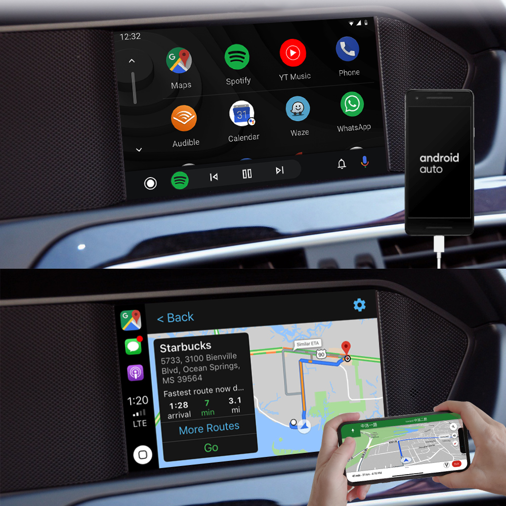 Mit diesem Modul fügst du drahtloses Apple CarPlay, Android Auto, AirPlay und Mirroring hinzu. So nutzt du deine bevorzugten Navigations-, Musik- und Kommunikations-Apps direkt im Fahrzeug, ohne dauerhafte Anpassungen vorzunehmen.
