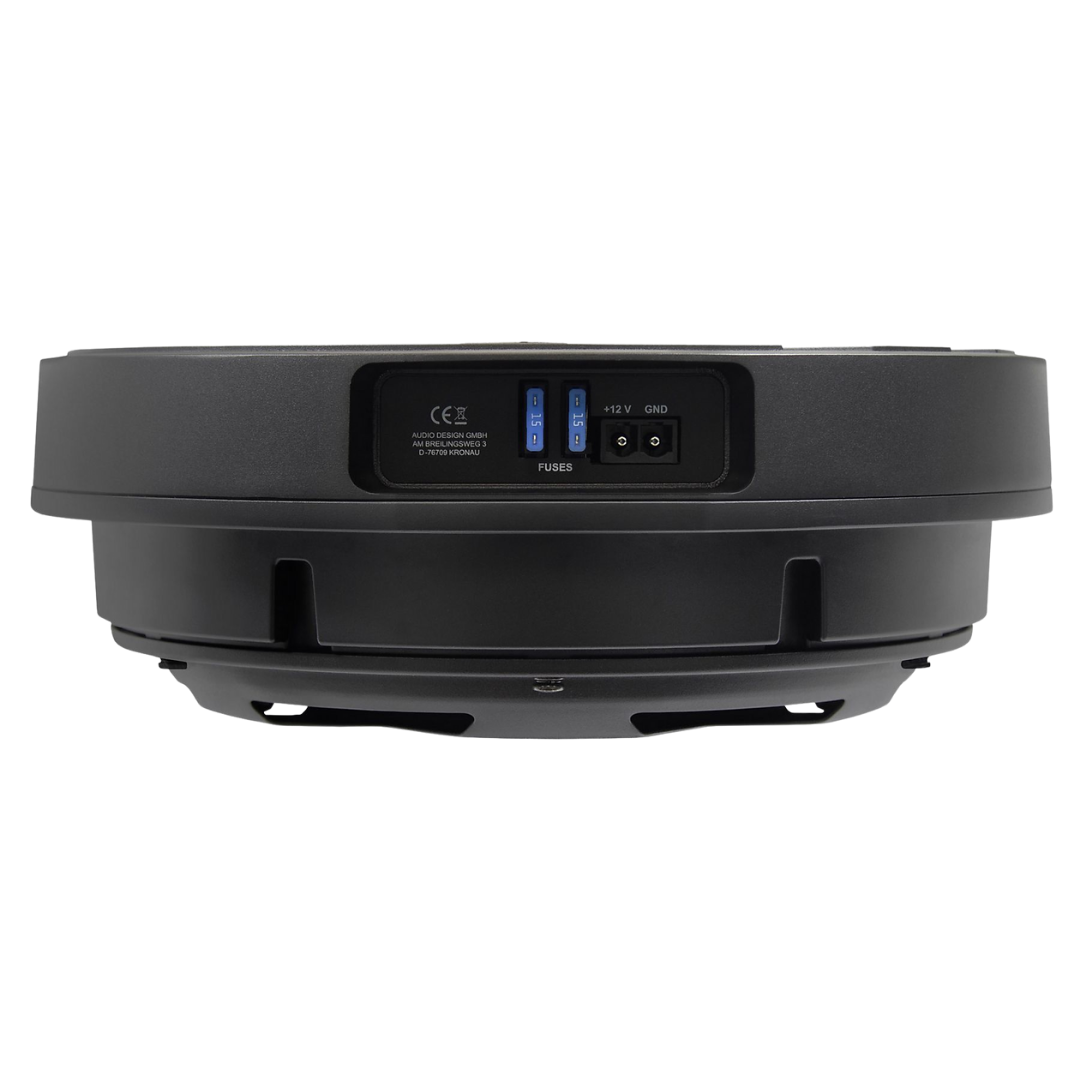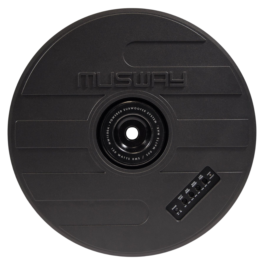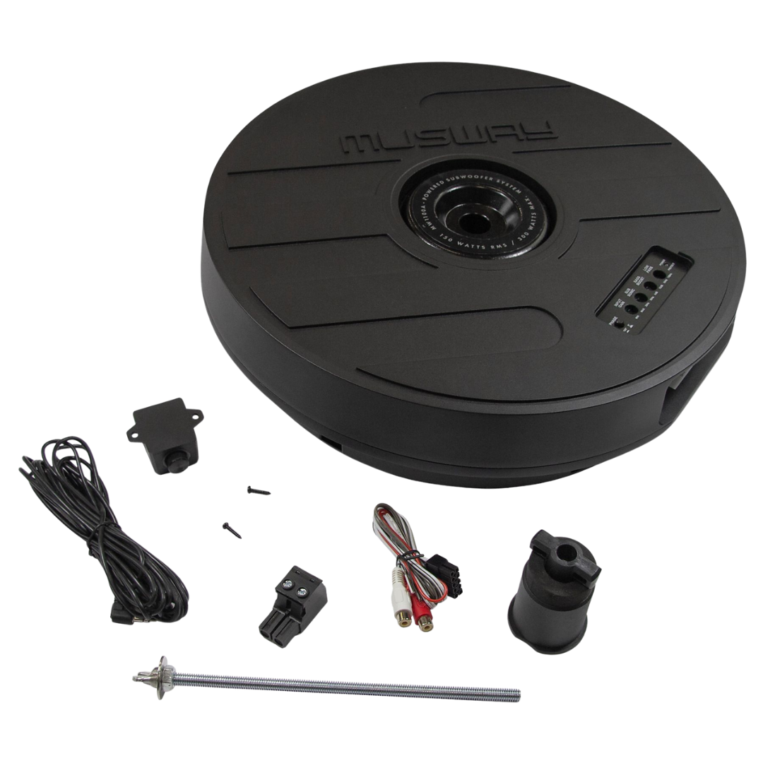 Aktiver 28 cm (11") Subwoofer zur Montage im Reserverad, mit 150 W RMS Class-A/B-Verstärker. Der MUSWAY MW1100A liefert präzisen, tiefen Bass in einem extrem kompakten Aluminium-Design und lässt sich bequem über die integrierte Bedienoberfläche und die Bass-Fernbedienung steuern.
