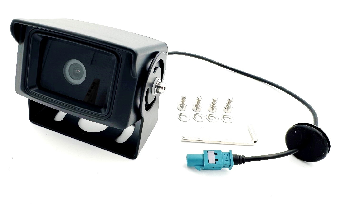 Fahrzeugspezifische Aufbau-Rückfahrkamera AHD 720p in schwarz für Transporter auf Fiat Ducato 8-Basis mit Uconnect R1 EXT Harman Head-Units mit separatem 10 Zoll Tablet-Monitor, die werkseitig auf Kamera kodiert sind. Die Kamera hat einen Fakra-Stecker am Anschlusskabel und die Stromversorgung erfolgt über Phantomspeisung der Head-Unit (Center-Pin-Power), d.h. für den Betrieb der Kamera ist nur ein zusätzliches Fakra-Verlängerungskabel notwendig.