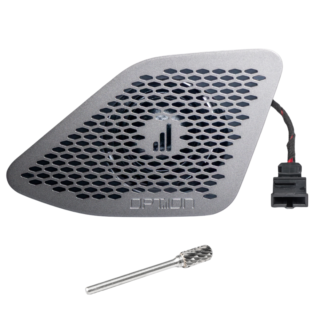 Er wordt een speciale kleine freeskop meegeleverd voor je boormachine. Hiermee verwijder je eenvoudig het originele plastic roostertje in de A-stijl. Daarna klik je de PRO-tweeter met het RVS rooster direct vast op de originele plek.
